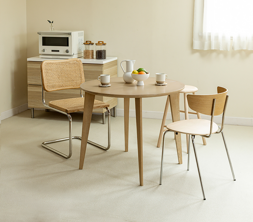 丸テーブルの周りをそれぞれが好みのイスで囲んだティータイム |