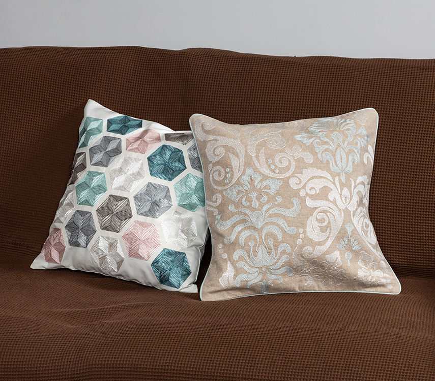 クッションカバー 40×40 ベージュ地青&白刺繍